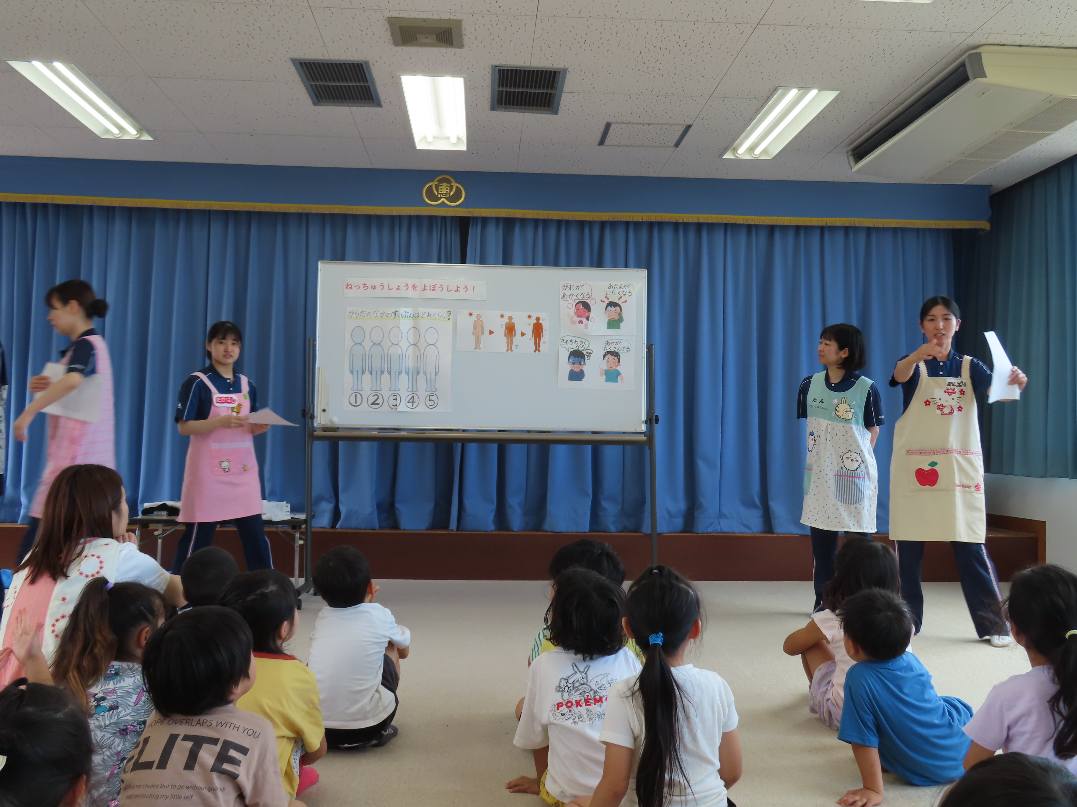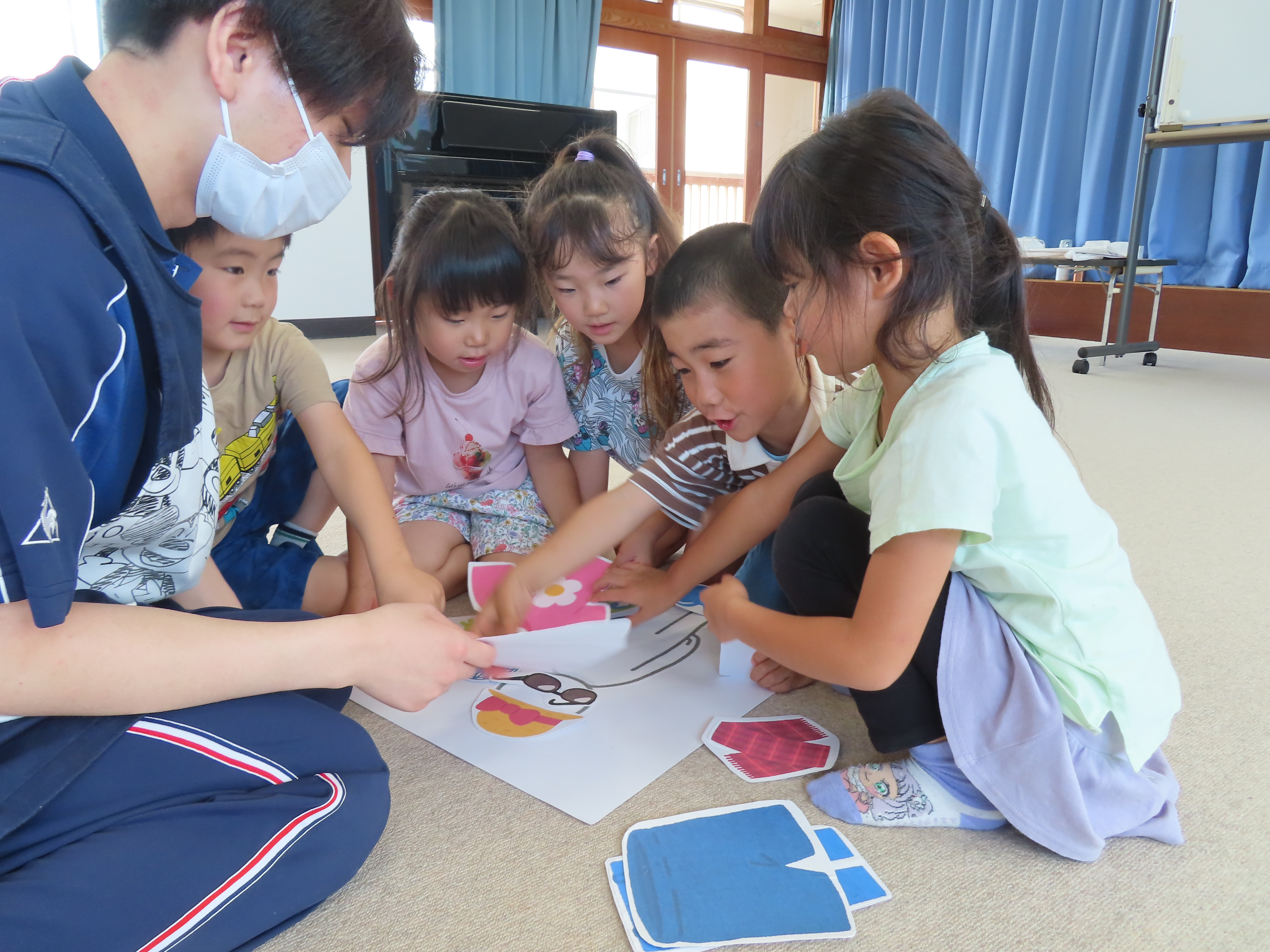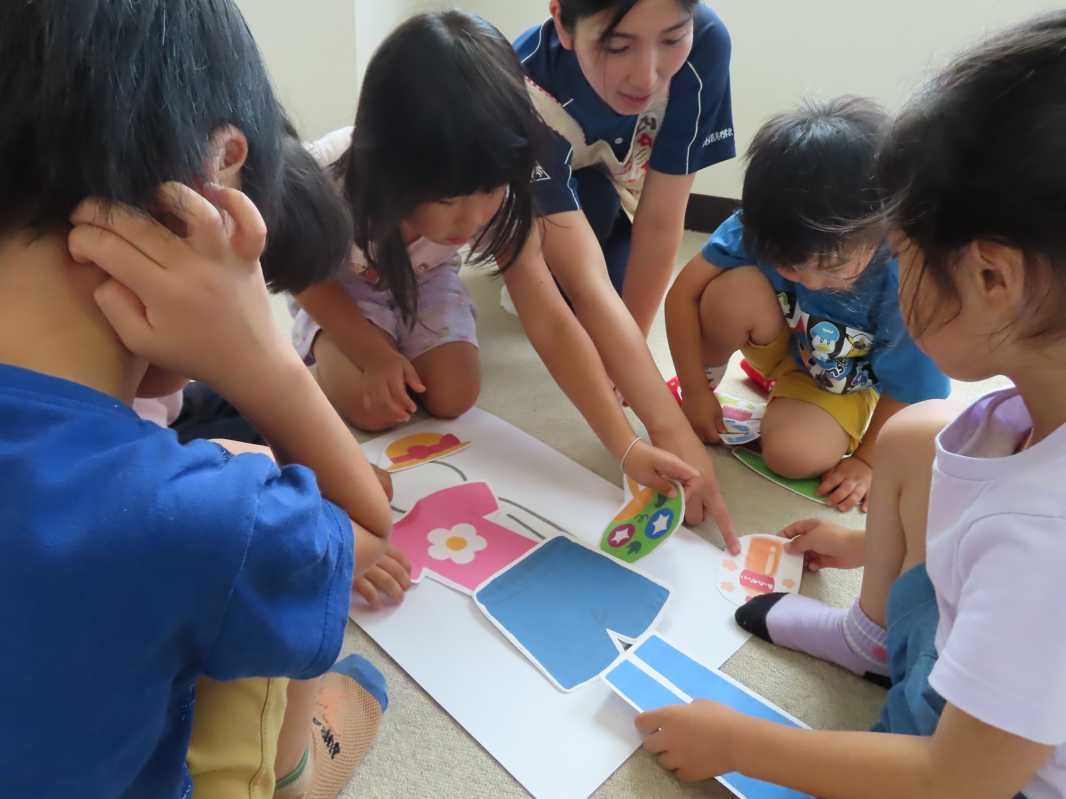 実習生たちが、年長児さんたちに健康教育として「熱中症について」のお話しをしてくれました。外では帽子を被ること、水分をとること、具合が悪くなった時は、大人にすぐに伝えることを教えてもらい、その後は、グループに分かれて、暑い時はどんな服装で過ごしたり、どんな物を使えば良いかを自分たちで考えて人の絵の上に置いてみることに。「暑いから、長ズボンより半ズボンよね!」「あったかい飲み物より冷たい飲み物がいい」自分の意見も発しながら、完成させていました。今年の夏も、とっても!!!暑そうです(*_*; 熱中症に気をつけながら、この夏も元気に楽しく乗り越えたいですねっ!!