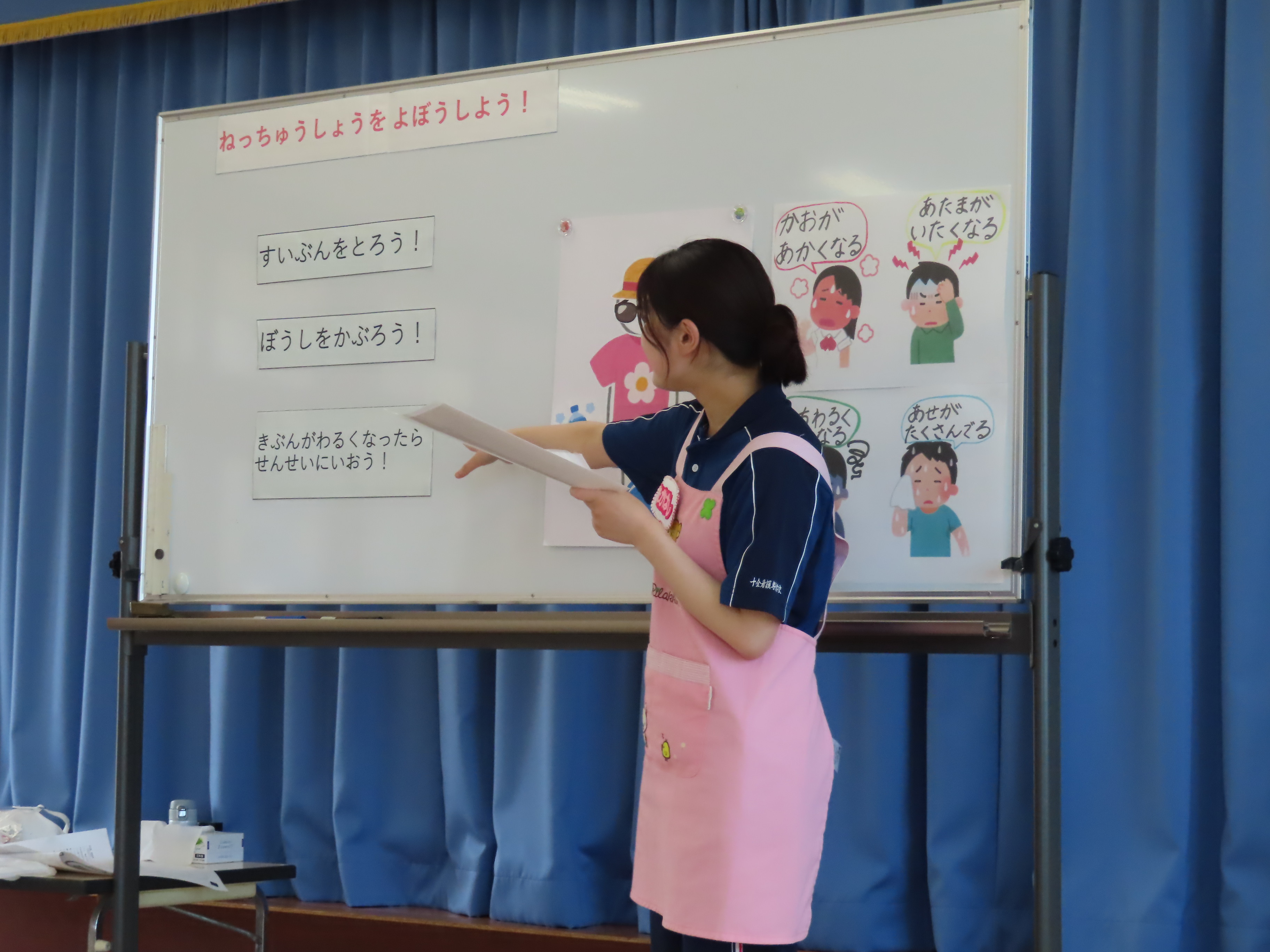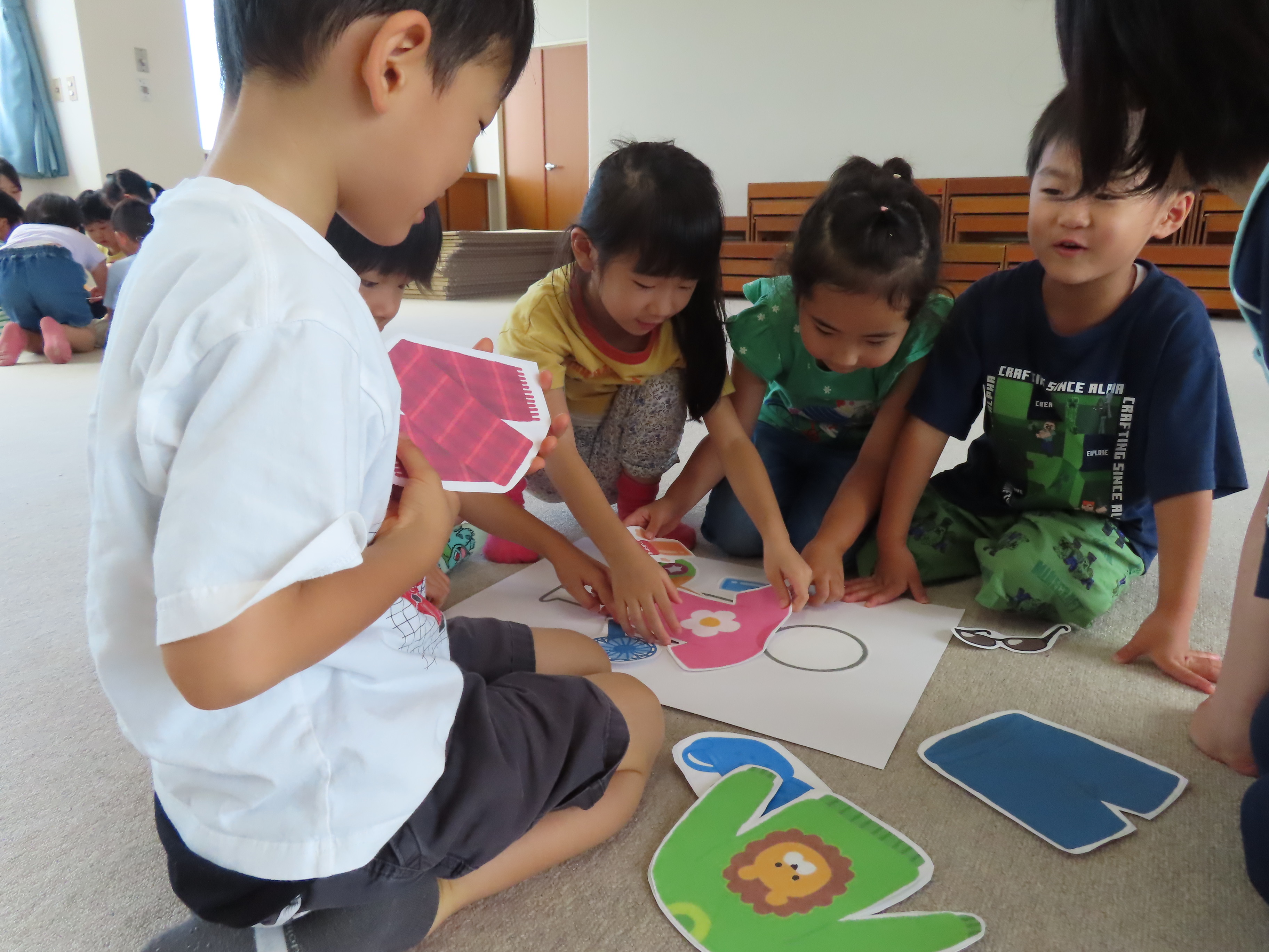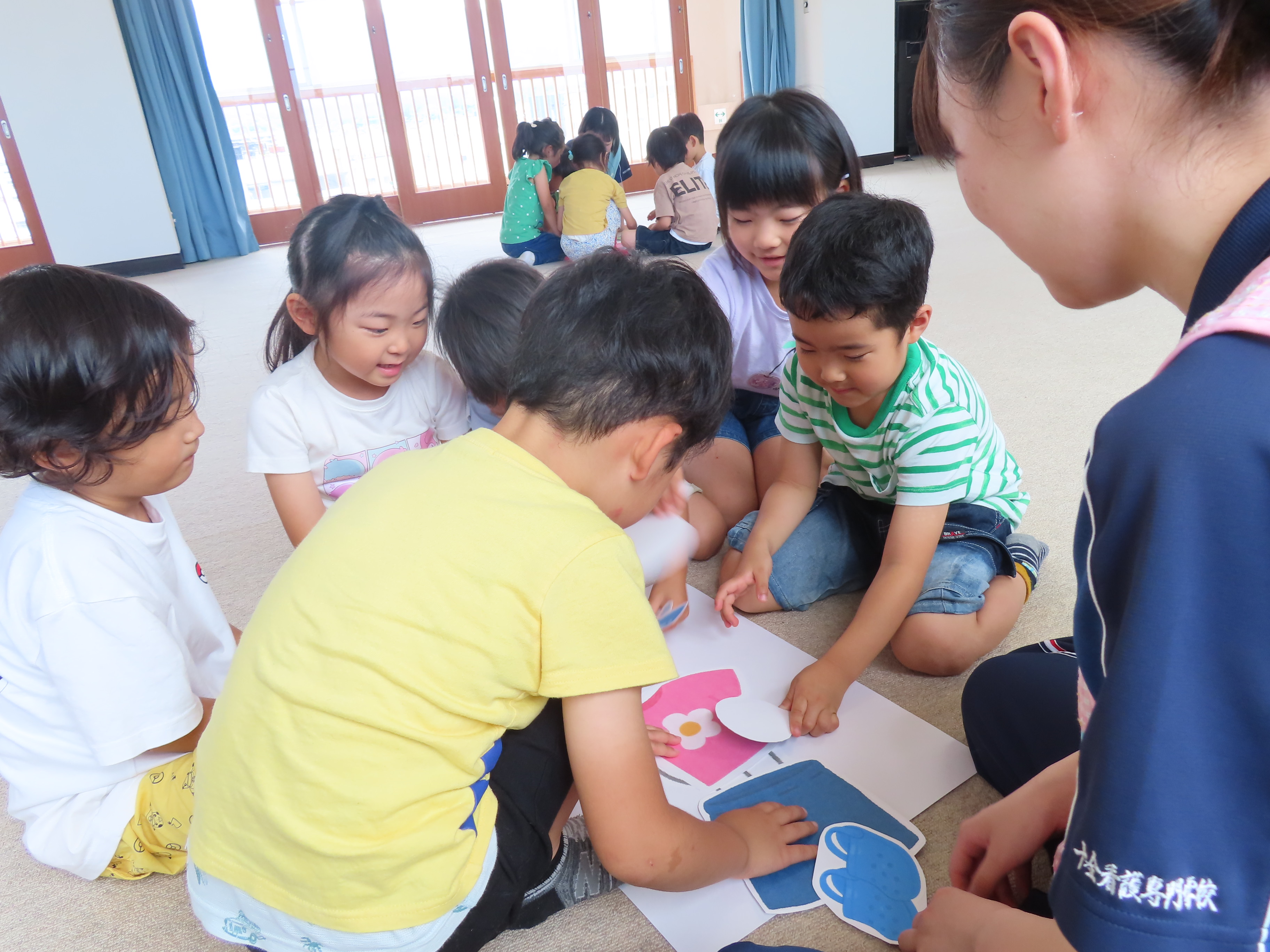 実習生たちが、年長児さんたちに健康教育として「熱中症について」のお話しをしてくれました。外では帽子を被ること、水分をとること、具合が悪くなった時は、大人にすぐに伝えることを教えてもらい、その後は、グループに分かれて、暑い時はどんな服装で過ごしたり、どんな物を使えば良いかを自分たちで考えて人の絵の上に置いてみることに。「暑いから、長ズボンより半ズボンよね!」「あったかい飲み物より冷たい飲み物がいい」自分の意見も発しながら、完成させていました。今年の夏も、とっても!!!暑そうです(*_*; 熱中症に気をつけながら、この夏も元気に楽しく乗り越えたいですねっ!!